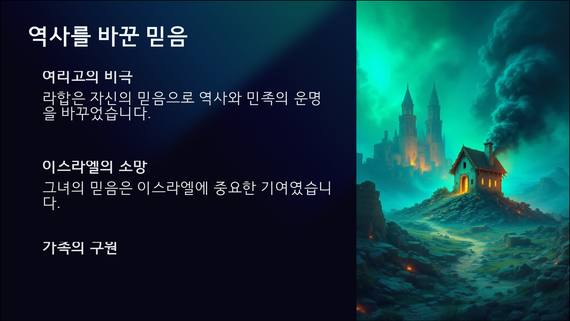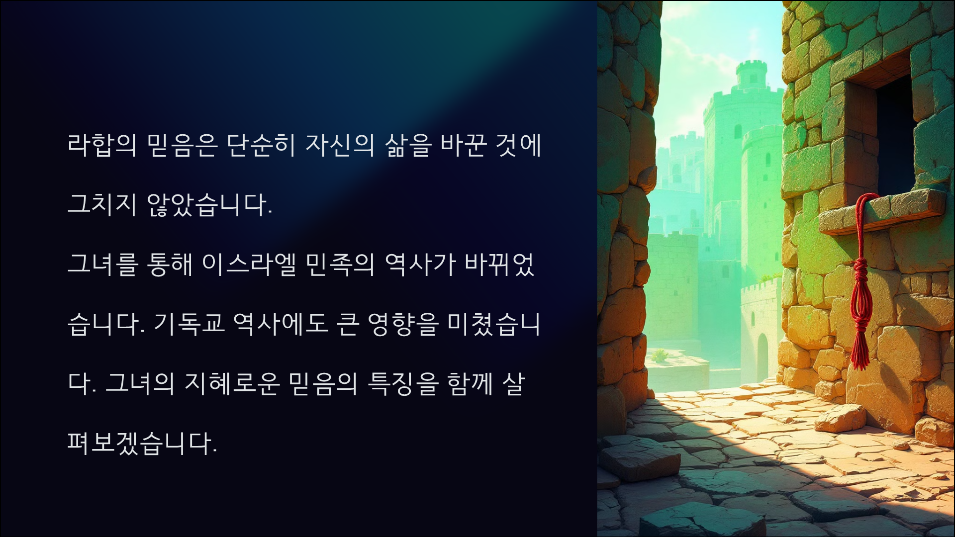 라합의 믿음은 그녀 개인만을 위한 것이 아니었습니다. 하나님은 그녀를 통해 구원의 역사를 이어가셨고, 결국 예수님께로 연결되는 위대한 계획을 이루셨습니다.