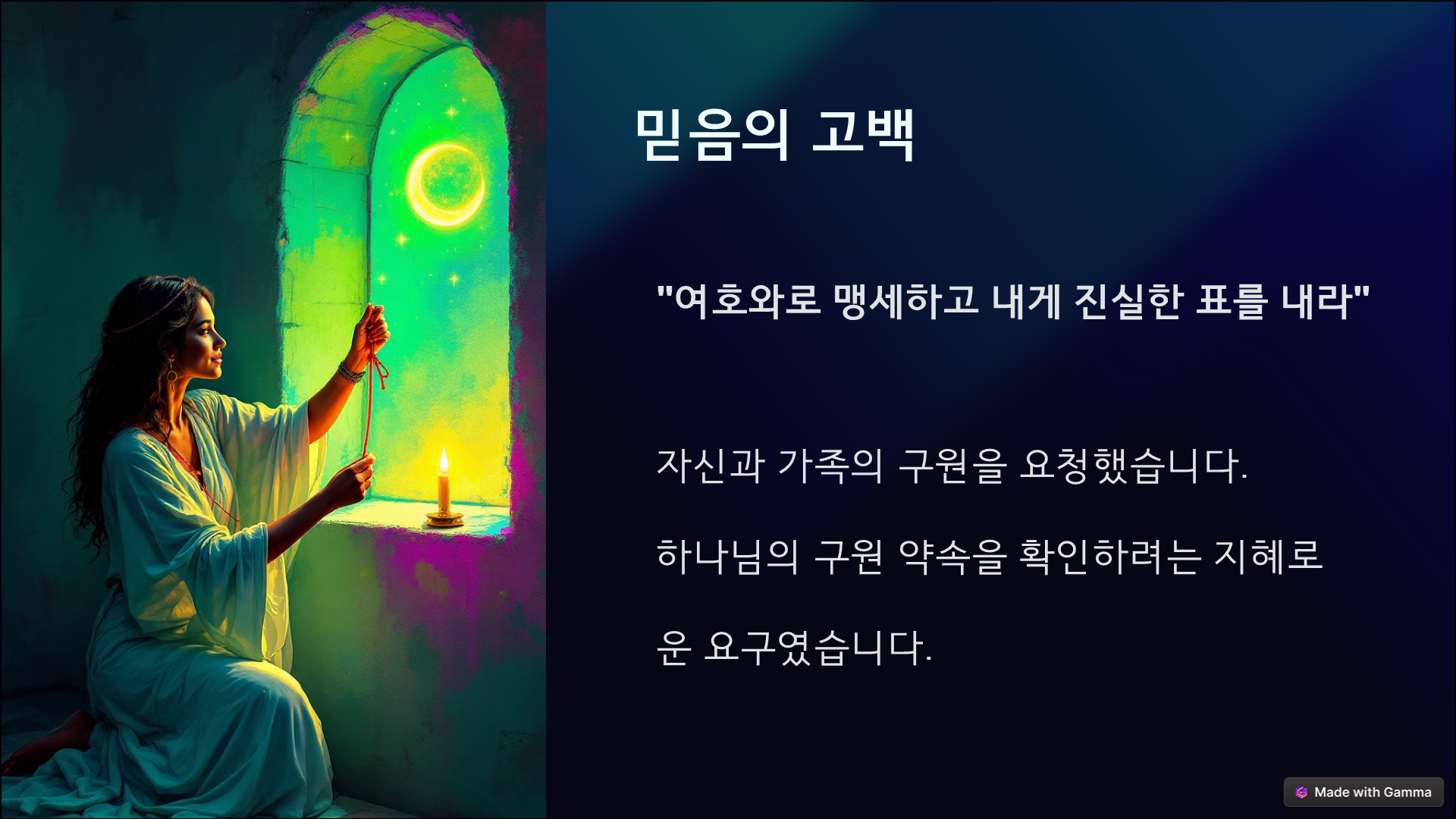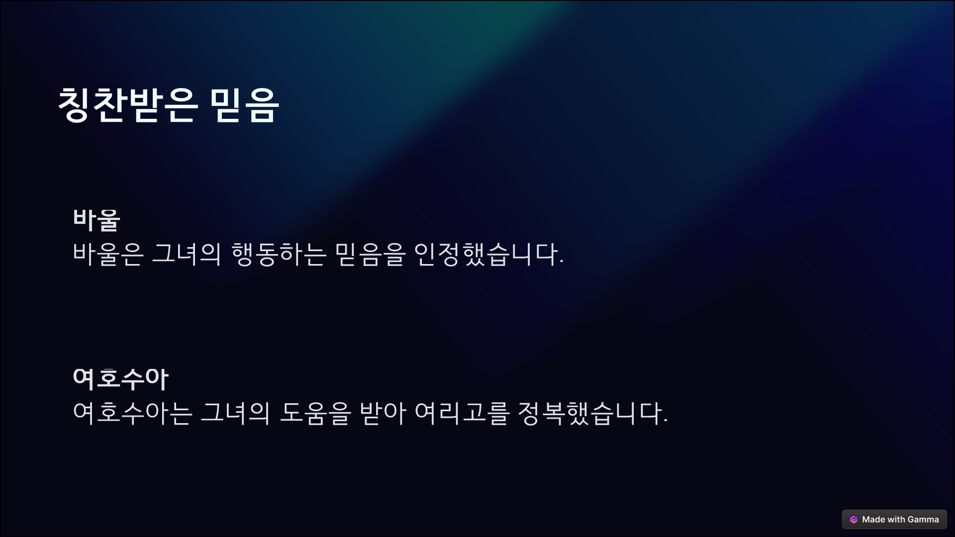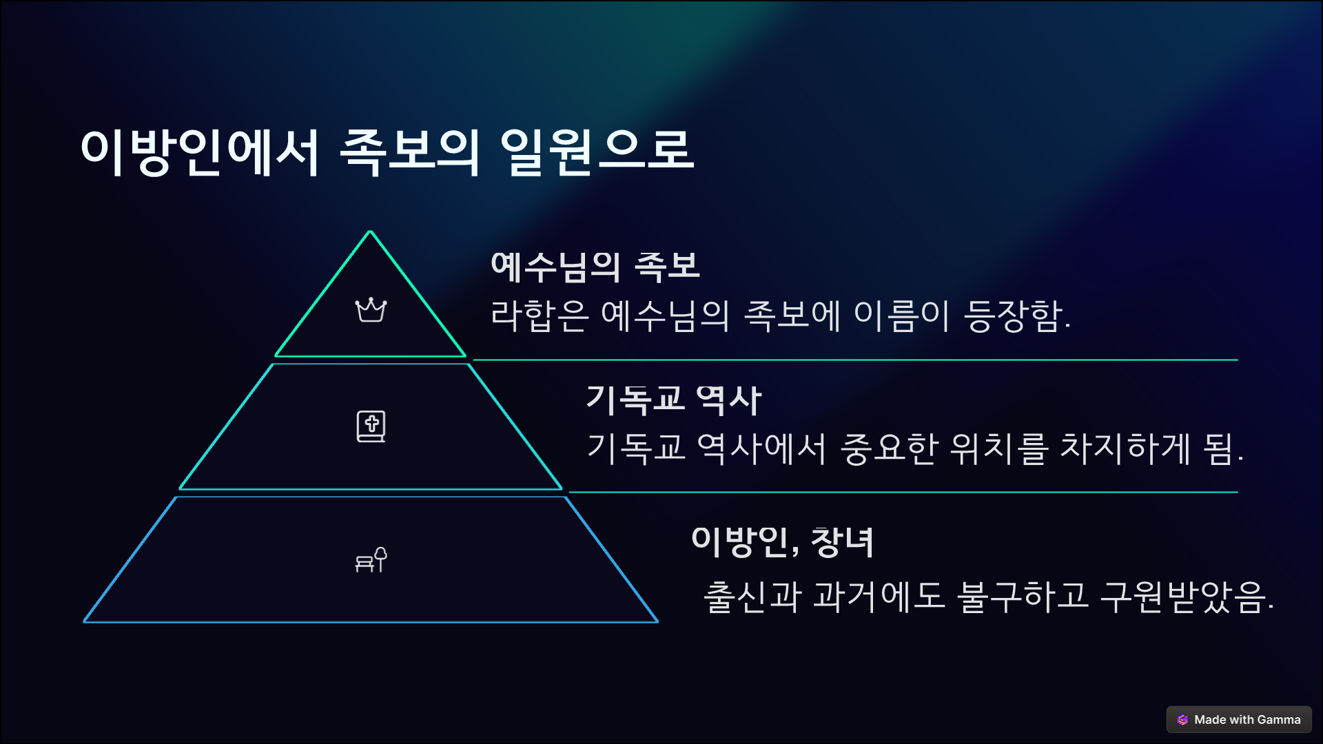 오늘날 우리도 출신이나 배경에 상관없이, 오직 믿음으로 하나님께 나아갈 수 있습니다. 그리고 우리가 하나님의 자녀로 받아들여졌다면, 그 사랑을 또 다른 이들에게도 전할 수 있어야 하겠습니다.