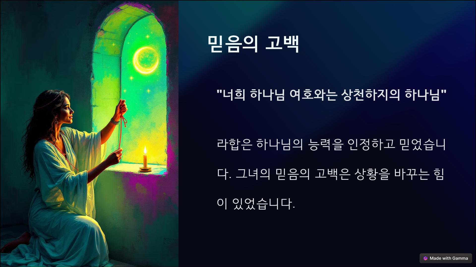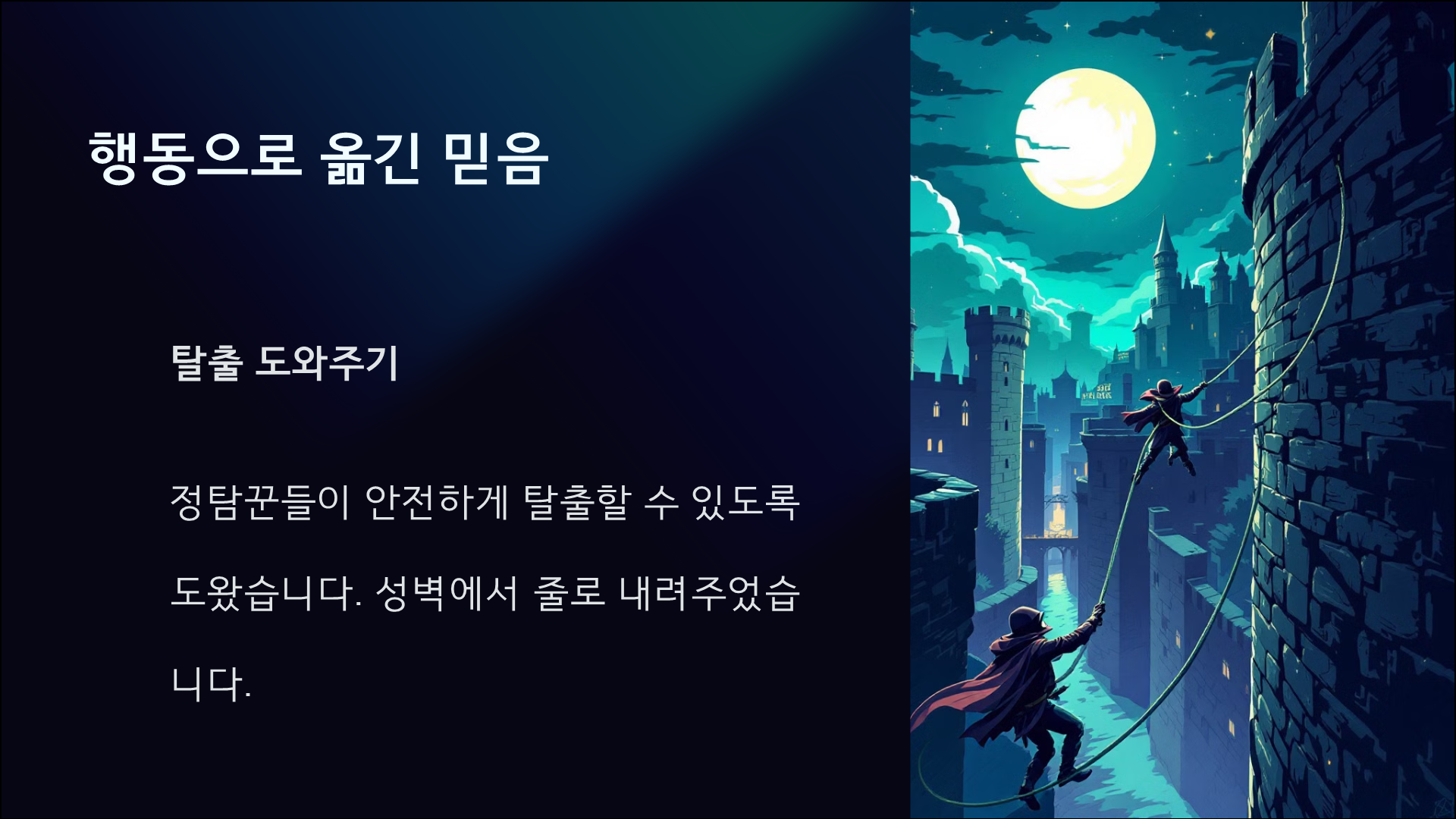 우리도 라합처럼 믿음으로 순종할 때, 하나님께서 우리를 통해 놀라운 일을 이루실 것입니다. 아무리 작은 믿음이라도 하나님께 드리면, 하나님은 그것을 통해 큰 구원의 역사를 써 가십니다.